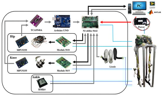 The control circuit for the exoskeleton robot is shown in Figure 2, in which the NI sbRIO-9632 (USA) consisting of a real-time controller, reconfigurable IO modules (RIO), FPGA modules and an Ethernet expansion chassis is employed for real-time control. The four channels of the NI 9234 buffer, condition and sample the input signals through a 24-bit Delta-Sigma ADC. The output analog signals are enabled by NI 9263 through four channels that have the specification of ±10 V, 16-bit, 100 kS/s. The controller design and feedback measurements are implemented using the Labview (v8.5) system.