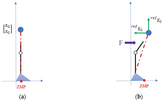 Currently, the balance recovery is considered on the sagittal x-z plane as shown in Figure 3. The reference position defines a desired ZMP position at which a disturbed human needs to regain the balance stability. From Equation (1), the reference acceleration of COM is designated as