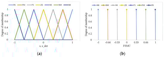 in which the positive coefficients can be defined by the following stability analysis. The fuzzy function FSMC accounting for the uncertainties and eliminating the chattering maps two normalized inputs s(t), and (t) to the linguistic output. The Mamdani-inferred rules with seven fuzzy partitions, NB (Negative Big), NM (Negative Medium), NS (Negative Small), ZO (Zero), PS (Positive Small), PM (Positive Medium) and PB (Positive Big), are used for the fuzzy inference. The membership functions of input and output linguistic variables are defined in Figure 4. As proposed in [39], the product inference with singleton fuzzification and centroid defuzzification methods is used for the fuzzy implications. The fuzzy function is normalized as and has been set as ()(.