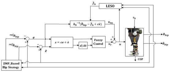 Note that only hip joints are assisted by the exoskeleton robot for balance recovery; thus, a controller is designed for the hip joints. The other joints, i.e., knee and ankle, are controlled by the wearer. To ensure an accurate tracking of the reference motion of the hip joint, , integrated using the hip velocity extracted from Equation (4), i.e., , a LESO-based FSMC is developed.