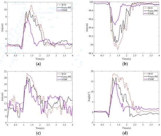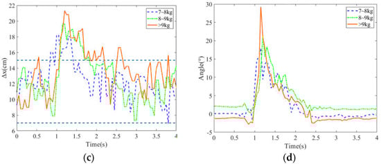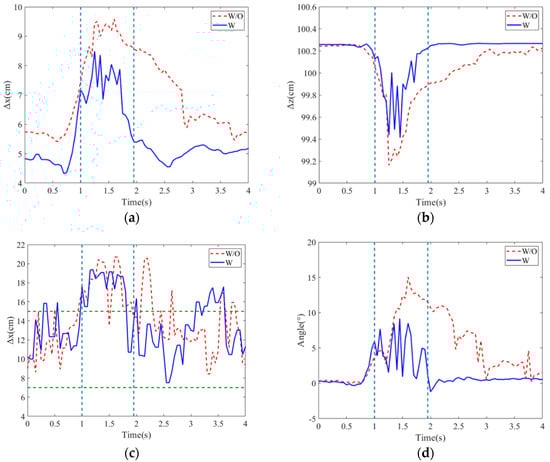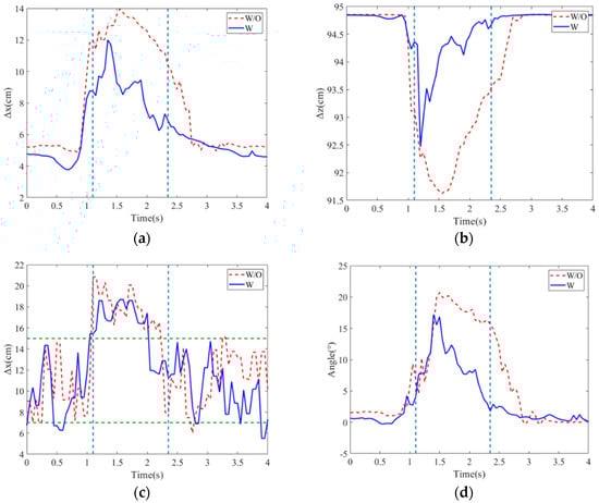 In this experiment, the balance recovery evaluation for the subject with and without the exoskeleton was conducted. The stability region was assigned 6~17 cm from the heel. Figure 7a–d present the deviation positions of the COM and COP, as well as the hip joint angle variations. Without external assistance, the subject’s maximum deviation positions of COM and COP are, respectively, 10.58 cm and 21 cm, and the hip joint angle has the maximum . In addition, it takes 1.5 s to recover the body to the balance posture.