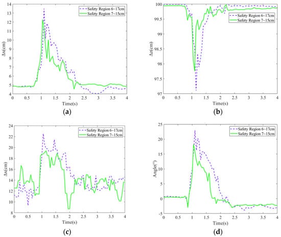 In the subsection, the balance recovery with exoskeleton robot assistance using LESO-FSMC was investigated for different stability regions, in which a stability region was set as 6~17 cm from the heel, and the other one was a smaller region of 7~15 cm. After the subject was pushed by an 8.9 kg force, the COM deviation positions, COP deviation positions and the hip joint angles are shown in Figure 8a–d. It is seen that the tight safety region (7–15 cm) can respond to the push disturbance more rapidly, and then provide the assistance such that COM and COP present the smaller deviations, as well as smaller hip joint angles before the subject returns to a balance position.