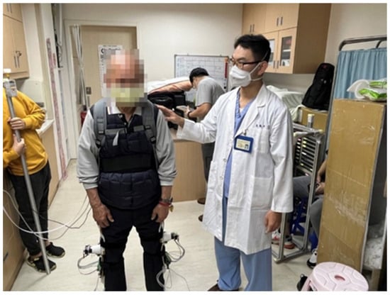 The investigation on standing balance recovery for PD patients wearing the proposed exoskeleton robot was conducted at the Attending Physician of Department of Physical Medicine and Rehabilitation, Taipei Veterans General Hospital. Because of the tentative investigation on standing balance recovery for PD patients, subjects with mild PD symptoms were selected. Therefore, two PD patients who, respectively, were rated with the Hoehn and Yahr scale stage 1 and stage 2 on standing balance activities (DT) attended the clinical trials as shown in Figure 10 [40]. All experimental protocols were approved by the TMU-Joint Institutional Review Board. Following preceding procedures, the PD patients stood with the proposed exoskeleton robot being worn. A thrust was applied to the patients’ back. If the subjects identified a balance loss, then the exoskeleton robot would be triggered to assist the balance recovery until the patients recovered to the equilibrium state. The COM variations, the COP variations and hip joint angles were measured and calculated to investigate the effectiveness for PD patients with/without lower-extremity exoskeleton assistance.