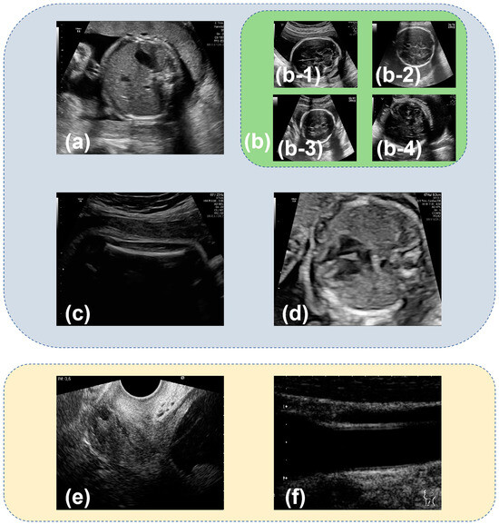 Representative images from Burgos-Artizzu’s dataset [22] depicting various fetal ultrasound standard planes: (a) fetal abdominal standard plane; (b) fetal brain standard plane; (b-1) fetal trans-ventricular standard plane; (b-2) fetal trans-thalamic standard plane; (b-3) fetal trans-cerebellum standard plane; (b-4) other brain standard plane; (c) fetal femur standard plane; (d) fetal thorax standard plane; (e) maternal cervix; and (f) other. (a–f) are samples for six categories classification. (a–f) are samples for nine categories classification.