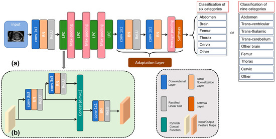The adaptation layer (Figure 2a) in the proposed LPC-SonoNet was a block from SonoNet [15]. This layer had two convolutional layers, providing a feature map with K channels, where K was the number of categories. The adaptation layer was designed for taking images with variant sizes as the input and for explicitly searching for the region of interest in the image with the max-pooling layer [15,31].