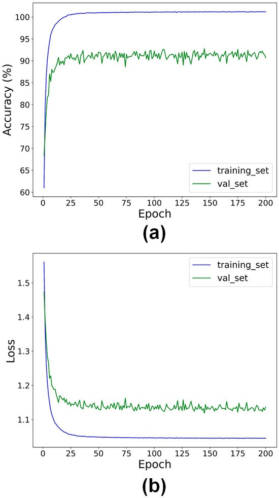 Figure 3 shows the accuracy and loss on the training set and validation set as a function of training epochs. As the epoch increased, both the accuracy of the training and validation sets increased, and the loss of the two sets decreased, illustrating that there was nearly no overfitting when training the LPC-SonoNet model. The small local fluctuations for the accuracy and loss curves of the validation set may be due to the small sizes of the validation set.