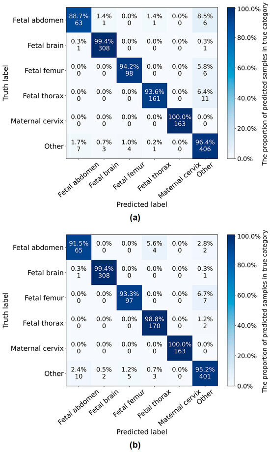 The confusion matrix of six-category classification of standard planes by the proposed network (b) and SonoNet64 (a).