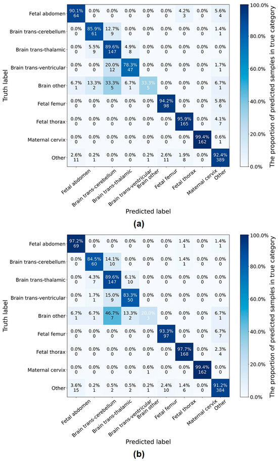 The confusion matrix of nine-category classification of standard planes by the proposed network (b) and SonoNet64 (a).