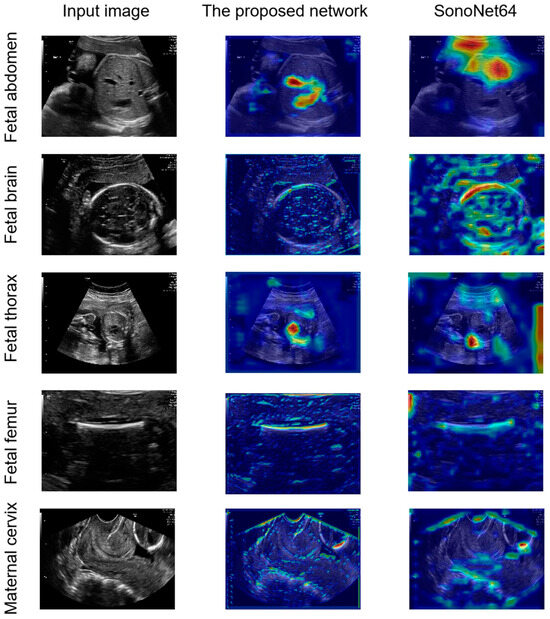 The comparison of heatmaps from the proposed network and SonoNet generated by the gradient-weighted class activation mapping (GradCAM) [34] technique.