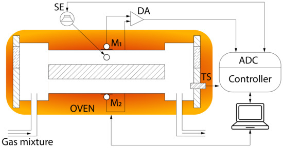 To investigate the effect of the gas mixture temperature on the resonant frequency, the PAD used in earlier studies [13,17] was modified to incorporate a temperature-resistive platinum sensor (TS). The sensor is mounted on a printed circuit board, with a corresponding hole drilled in the buffer cavity of the PAD, sealed using a rubber gasket. Signals from the TS are transmitted to the controller, which then sends the data to the PC for further processing. To regulate the temperature of the measurement cell, we employed an oven with a Peltier element, managed by an MTDEVAL1 Thorlabs controller.