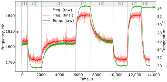 During the experiments, temperature and resonant frequency measurements were recorded every 2 seconds. The temperature was measured using a resistive platinum Pt1000 sensor with an accuracy of 0.1 °C, while the resonant frequency was captured with built-in microphones and an emitter. This experimental setup generated two synchronized time series: one representing the temperature and the other the resonant frequency, both sampled at the same 2-second intervals.