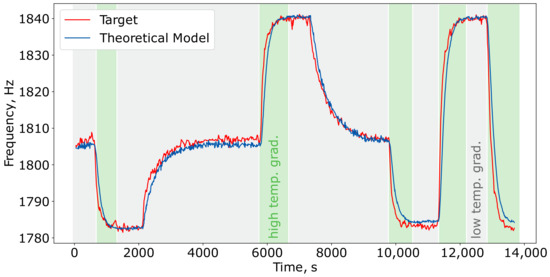 The primary metrics for fitting this model to the data from the “1010 ppm ” dataset are summarized in Table 2. The application of the trained theoretical model to the test subset is illustrated in Figure 3. In this figure, the areas with gray and green shading indicate time intervals characterized by low- and high-temperature gradients, respectively.