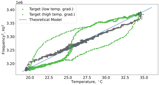 Figure 4 illustrates the relationship between the predicted resonance frequency (blue line) and the target resonance frequency (green and gray dots) as a function of temperature. The gray dots indicate measurements taken in regions with low-temperature gradients, while the green dots represent measurements from areas with high-temperature gradients (the same as in Figure 3). The figure demonstrates that the basic theoretical model reasonably and accurately captured the cell’s resonance frequency in low-temperature gradient regions. However, it struggled to provide accurate predictions in regions characterized by high-temperature gradients.