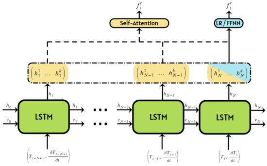 The LSTM network was fed with two time-series inputs to predict the resonance frequency at time t: the temperature series and the temperature derivative series . Thus, at each time step t, the LSTM cell received two values: and . The hyperparameter N was an adjustable parameter of the LSTM network. By using both the current temperature and its derivative, the model was able to compensate for potential temperature estimation errors and account for any lag in determining the actual gas temperature. Incorporating values from previous time steps allowed the LSTM network to more accurately solve the differential equation and predict the resonance frequency in real time.