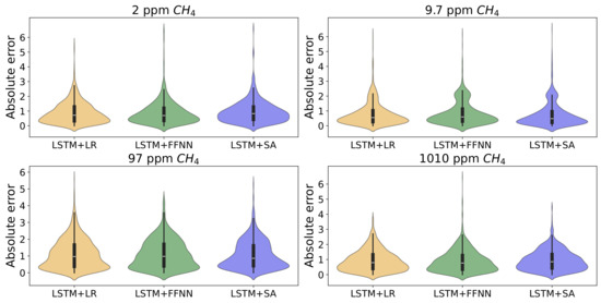 For a more detailed comparison of the LSTM-based models, we analyzed the MAE distribution using violin plots, as shown in Figure 6. The shapes of these distributions demonstrate that all models performed effectively, with the median MAE staying below 1 Hz for most concentrations. However, for the 97 ppm concentration, the LSTM + SA model stood out with a notably lower median MAE, well below 1 Hz. Additionally, the distributions’ tails decayed faster as the MAE increased, indicating fewer extreme errors for this challenging concentration.