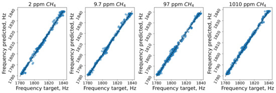 The error distribution across the range of cell resonance frequencies for the LSTM + SA model is shown in Figure 7. The spread of points around the diagonal is relatively consistent, without significant deviations or outliers for any specific concentration. This suggests that the model performed consistently across different frequencies and methane concentrations.