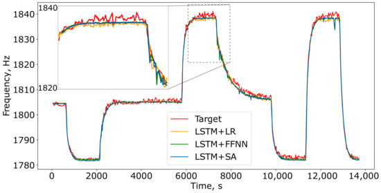 Figure 8 illustrates how the best-trained models reconstructed the resonance frequency on the test subset of the “2 ppm ” dataset. All models effectively captured the frequency variations, with the LSTM+SA model providing the smoothest and most accurate predictions over the 4-hour measurement period.