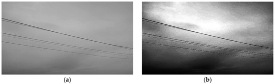 The images of the supplementary conductors relayed by the video monitoring terminal are in color, specifically utilizing the RGB color model. These images have substantial data volumes, consuming considerable connection capacity and resulting in sluggish transmission speeds and diminished efficiency. In galloping monitoring, color features are not critical for the analysis of the amplitude and frequency. Various grayscale levels can denote the chroma and brightness levels of the supplementary conductors in the image. Grayscale photos diminish the data volume and enhance the algorithm efficiency. A local backdrop image of the supplementary conductors is chosen and processed utilizing three grayscale techniques to transform the RGB color image into a grayscale image, as seen in Figure 10.