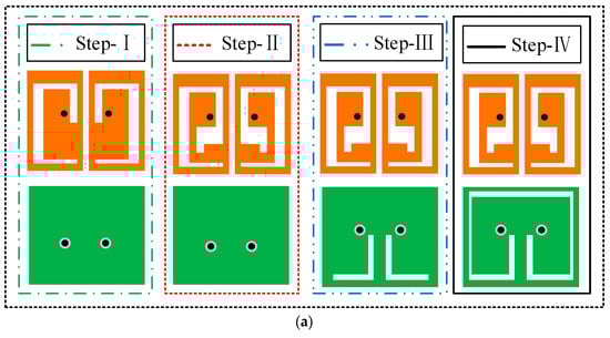 The MIMO antenna is characterized by a continuous ground plane, which is shared by both radiating units. The design steps are shown in Figure 3a,b, illustrating the comparison of the results of S11, S21, and AR corresponding to each design step. In Step I, a slot is introduced into the radiating patch, resulting in the antenna resonating at 2.8 GHz. It has isolation greater than 22 dB and a 3 dB ARBW of 0.14 GHz (2.53–2.67 GHz). In Step II, to shift the resonance point and the axial ratio point to the left, two L-shaped rectangular slots are integrated into the ground plane. This modification influences the antenna’s impedance characteristics, resulting in a leftward shift of the resonance point and an expanded bandwidth. In Step III, vertical slits are added at the ends of the L-shaped rectangular slots. These slits introduce additional capacitance to the antenna, increasing its reactance. Consequently, the resonance frequency is lowered, resulting in enhanced impedance matching. However, this modification reduces the antenna’s isolation and the effectiveness of the circularly polarized AR. Thus, in Step IV, a horizontal slot is incorporated to connect the two U-slots in the ground plane. Ground-plane slotting introduces an additional reactance effect on the ground plane, which helps to achieve more stable circular polarization characteristics while increasing the ARBW. The findings reveal that the antenna achieves a resonant frequency of 2.45 GHz and an isolation level exceeding 27.5 dB. Additionally, it achieves an FBW of 28.16% and an effective ARBW of 16.3%.