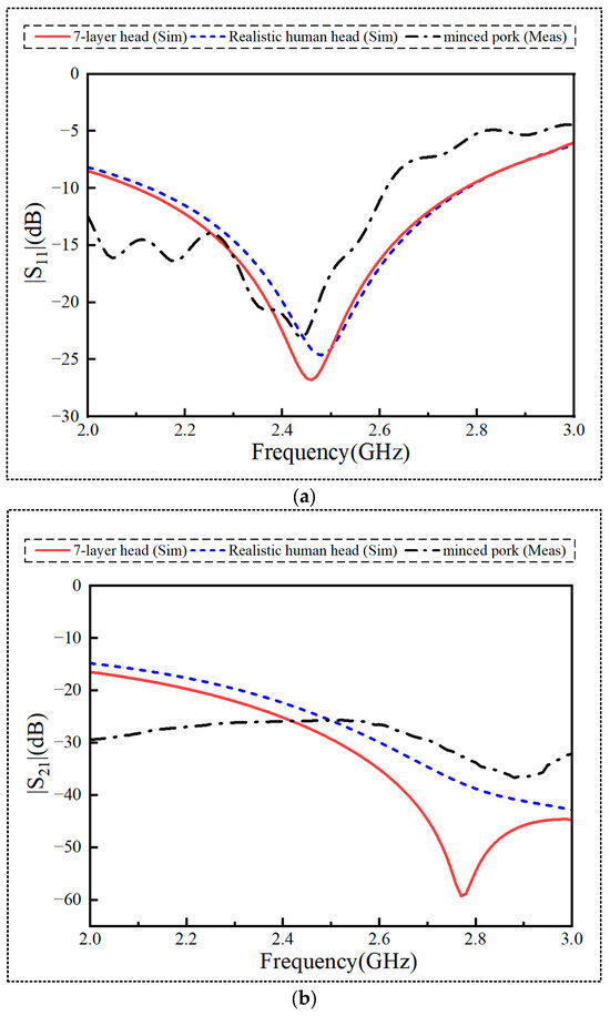 Figure 4b illustrates that, at 2.45 GHz, the |S21| value from simulations within the seven-layer homogeneous human head model was −27.5 dB. Conversely, the measured |S21| values were consistently below −26.5 dB across the operational frequency range. The minor discrepancy between the simulated and measured results may be due to factors such as the effect of soldering coaxial cables, which can influence the antenna’s surface wave propagation and the reflected field. This could cause surface waves to propagate from one port to the other, thereby affecting the antenna’s performance. It should be noted that, since the two antenna radiating units have similar geometries—|S11| = |S22| and |S21| = |S12|—only the results for |S11| and |S21| are presented in the figure, while |S22| and |S12| are ignored.