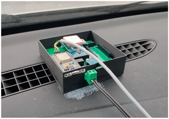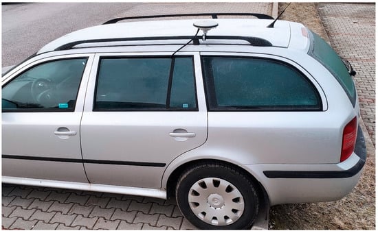 We designed and built a module for logging data from a passenger vehicle. The module has several sensors, specifically, a MEMS IMU unit, a barometer, and a GNSS receiver. The main microcontroller is ESP32, which has a Wi-Fi and Bluetooth wireless connection. It detects information from the car’s control unit via the ODBII connector via Bluetooth wireless communication. The module logs all data on the SD card to a CSV file. After arriving at a certain location, it connects to the Wi-Fi network and sends the measured data to the server for further processing. The module was described in more detail in [33,34]. The ground-truth location has been captured by SPAN-CPT from NovAtel, which is a navigation-grade GPS+IMU system incorporating fiber optic gyroscopes (FOGs) and MEMS accelerometers, which are tightly coupled with a GNSS receiver. We placed the data logger module on the dashboard in a 3D-printed box, aligned with the axes of the vehicle (Figure 1). The location on the dashboard is not optimal since there is the structure of the vehicle under the module, which strongly deforms Earth’s magnetic field near the logger. On the other hand, this setup is very close to the real situation in the vehicle when the user mounts the navigation hardware on the dashboard or windshield. We placed the SPAN-CPT system above the rear axle of the vehicle and configured it for our purposes. The GNSS receiver antenna for the SPAN-CPT system was placed on the roof rails of the passenger car (see Figure 2).
