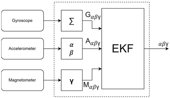 We can use the EKF to fuse data from the IMU unit. Figure 4 shows the EKF block diagram where the input is data from the IMU unit and the output is Euler angles. During the prediction cycle, the data from the gyroscope are added according to (1). During the update process, based on the prediction, α, β, and γ are calculated, which should be the values from the accelerometer and magnetometer; they are subtracted from the real data, which creates an error vector.