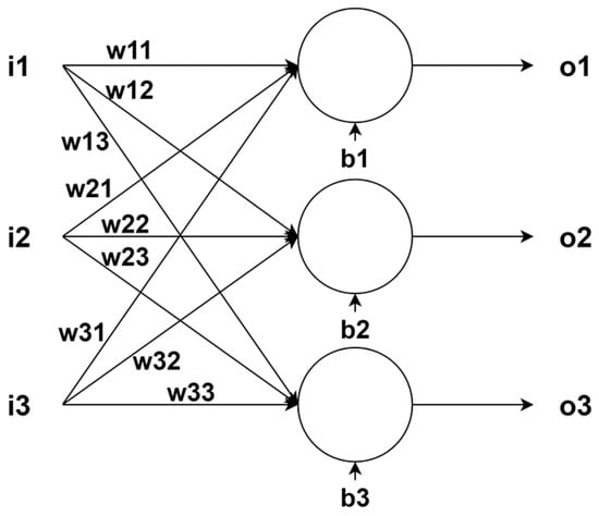 In the described way, we can determine the most likely position of the vehicle, but we must have knowledge of the noise variance of the sensors before running the algorithm, and all sensors must be calibrated. We can perform sensor calibration using traditional methods. However, our approach is to calibrate the sensors based on the position from the GNSS at a time when the GNSS signal is good. Calibration takes place through the backpropagation of the error through the entire algorithm. At the output of the sensors, we added neurons that serve as a calibration matrix, and their parameters are adjusted based on the backpropagation of the error. With such an approach, we guarantee a constant calibration of the sensors, and in the event of a GNSS failure, the position is predicted based on the INS. Kalman filter functions are written as classes under the “PyTorch” library, which uses tensors through which it can calculate the backpropagation of the error. Individual neural networks are placed between the sensors and the position prediction calculation. The neural network for the gyroscope, magnetometer, and accelerometer consists of three neurons (Figure 6), the inputs of which are connected to each neuron, and thanks to which, we can obtain dependencies between individual axes; for example, if the sensor is rotated not completely in the direction of travel. Such a calculation creates a 4 × 3 calibration matrix (34) and (35). For one neuron, we obtain only offset and gain. We set the initial parameters of individual neurons to wnk = 1 and bn = 0 so that the sensor readings are unaltered. This approach considers only first-order calibration. Using a more complex neural network, we could also compensate for certain non-linearity, but the training is more computationally demanding, and the calibration would take longer to converge. The block diagram of the described method is shown in Figure 7.
