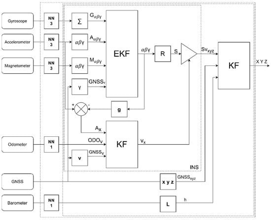 When combining different sensors, we must solve the problem of sensor fusion. The Kalman filter or complementary filter is most often used for the fusion [6]. Many articles have discussed the fusion of readings from GNSSs and IMUs that use traditional mathematical methods based on complementary filters and Kalman filters [6,7,8,9,10,11,12]. The EKF and its derivatives is the de facto standard approach for sensor fusion, but there are a few disadvantages as follows: