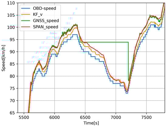 Comparison of estimated speed from odometry (blue), low-cost GNSS (green), navigation-grade GNSS (red), and Kalman filter (orange).
