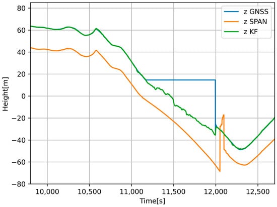 We wanted to compare the evaluation of the achieved results against the SPAN-CPT system. In Figure 8, we can see a comparison of the vehicle speed during a GNSS signal failure. The algorithm adjusted the calibration constants for the accelerometer and odometer that entered the KF. In Figure 9, we can see the elevation comparison. During the GNSS outage, altitude was predicted based on INS and barometer data. We compared the data with the reference sample from the SPAN-CPT system. We displayed the resulting data from the prediction on maps and compared it to the position from SPAN-CPT. As we can see in Figure 10, position prediction from the SPAN-CPT system was not accurate, even though it contained high-quality inertial sensors.