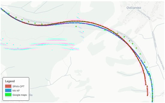 Hence, the position prediction from SPAN-CPT dead reckoning was not accurate enough to be considered as a reference value during an outage. That is why we decided to compare the data against the route generated from the map documents. But, we ran into a problem, where the maps of the tunnels from several sources did not correspond to reality since they do not match with each other. Online maps may show only a rough estimate of the underground road trajectory. Each of the tested map documents had the trajectory of the tunnels drawn slightly differently. The most accurate was the maps provided by Google. We have compared Google maps with the official maps provided by the Slovak Road Administration agency [37]. Hence, we generated a trajectory along which we walked and compared the data. We created a function that calculates the tangent to the trajectory from map data. The trajectory is shown in Figure 10, and the summary statistics are in Table 1. However, the comparison is not completely accurate, as the generated path was not the real road along which the vehicle traveled; also, when passing certain right-angled turns, the trajectory was curved, while in the generated route, the turn was sharp without shortening the trajectory. We have compared the errors of the proposed neural-calibrated Kalman filter system with the same system, where the neural networks were replaced by standard calibration parameters (gain, bias). The system was assembled in the same way, but at the input, there were no neural networks but calibration matrices. We have calibrated the gyroscope through the ZUPT algorithm (bias calibration was performed whenever the vehicle was stationary). Calibration of the magnetometer was performed based on the knowledge of the traveled path [33]. We did not calibrate the accelerometer in place because it was not possible to rotate the object (passenger vehicle) in all directions.