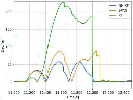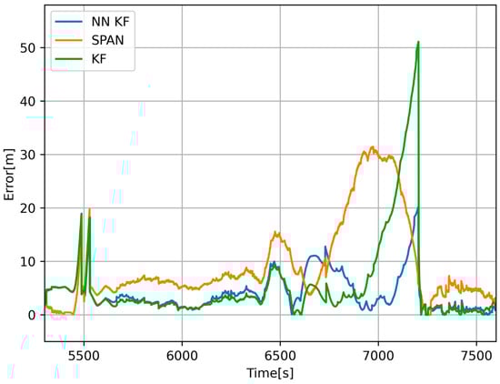Error of the estimated position from NN-calibrated KF (blue), navigation-grade GNSS+INS (orange), and offline-calibrated KF (green) with respect to the position obtained from map documents while traveling through the first tunnel.