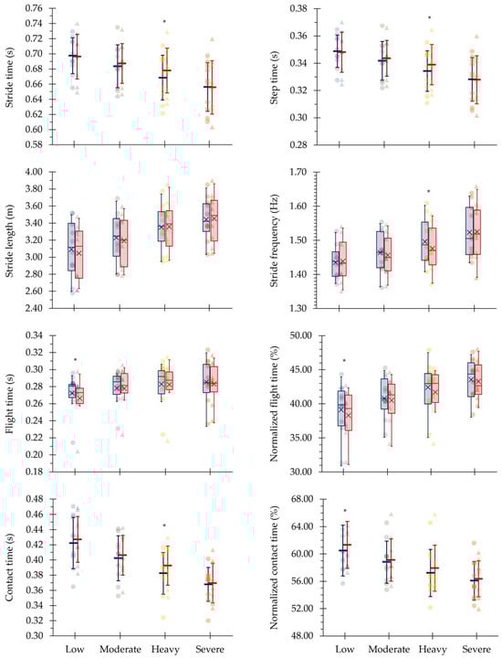 | Stride time (s) | 0.70 ± 0.03 m,h,s | 0.68 ± 0.03 h,s | 0.67 ± 0.03 s | 0.65 ± 0.03 | 0.905 | <0.001 |