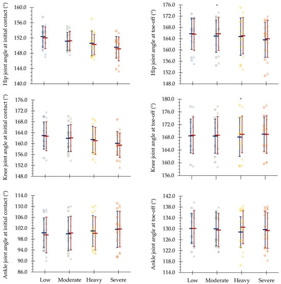 | Knee joint angle at initial contact (°) | 162.64 ± 5.30 h,s | 161.94 ± 4.91 h,s | 161.19 ± 4.93 s | 159.57 ± 4.49 | 0.698 | <0.001 |