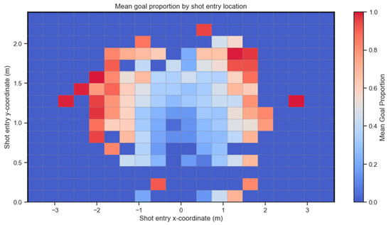 This heatmap shows the x and y coordinates of the goal mouth and the mean proportion of shots that ended up at the different locations in the goal. The goal mouth is 7.32 m wide and 2.44 m high (identical to the goal on a real soccer field). The spectrum represents the mean proportion of shots that resulted in a goal and ranges from red to dark blue (red = 1.0 and dark blue = 0.0 (no shot entered that zone)).