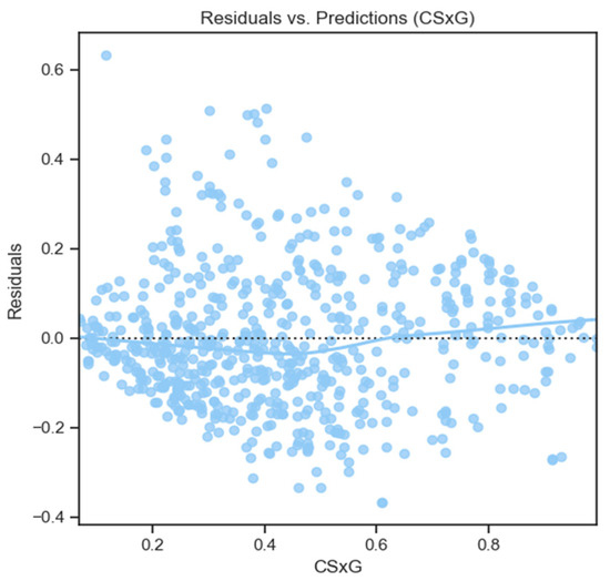 The metrics selected to evaluate the performance of the CSxG model were the coefficient of determination (R2) and root mean square error (RMSE). R2 ranges from 0 to 1 indicate how much of the variability in the dependent variable is explained by the regression model [26]. A value of 1 represents 100% explained variability, while a value of 0 indicates no explained variability. RMSE is the square root of the mean value of residuals, where residuals represent the difference between observed values and their corresponding predictions [27].