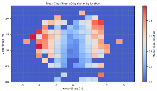To further validate these feature importances, alternative models such as XGBoost, a gradient boosting regressor, and a decision tree were employed. In all cases, RROC emerged as the most significant feature, with feature importance scores of 0.73 and 0.79 in XGBoost and the gradient boosting regressor, respectively (see Figure 4). As discussed in the feature engineering section (Section 3.1), RROC is influenced by both shot placement within the net and the time to act (i.e., flight duration of the shot). Figure 5 presents a heatmap of the mean CSxG for shots grouped by shot placement. Given that shot placement plays a central role in RROC, which, in turn, is a key factor in CSxG, it is unsurprising that this heatmap shows similar patterns to those presented in Figure 1 and recorded from thousands of sessions of gameplay.