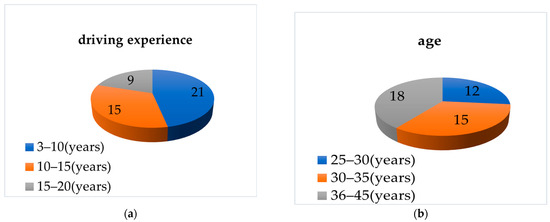 Preliminary research on the state of road hypnosis revealed that experienced drivers are more prone to road hypnosis compared to novice drivers [13,14,15]. Participants in the experiment are required to have a vision of at least 600 degrees. A total of 45 drivers were recruited for the experiment, with a gender ratio of 8:2. Specific information is shown in Figure 1.