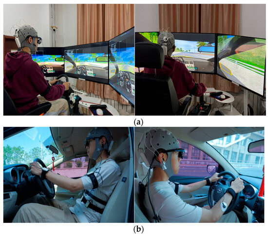 Vehicle driving experiments and virtual driving experiments are included in this study. The virtual driving experiment platform consisted of a six-degree-of-freedom platform, a Logitech G29 steering wheel and pedals, three 55-inch high-definition displays, and Unity 3D software (version 2021.3.29f1c1). The vehicle driving experiments platform primarily consisted of a comprehensive road test vehicle, a laptop, and a video recorder. The environments for both vehicle driving experiments and virtual driving experiments are shown in Figure 2.