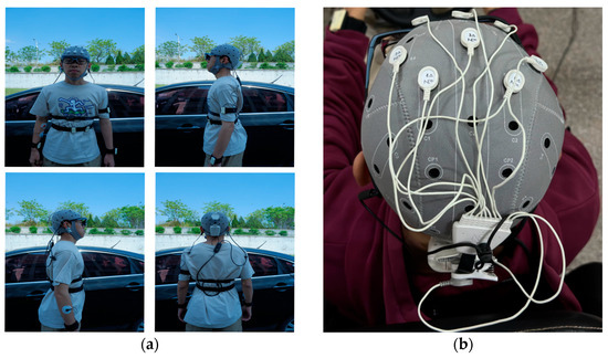 Eye movement data are collected with the aSee Glasses from 7invensun (Beijing, China) Technology Co., Ltd. There are functions for the full experimental process that include eye movement recording, data analysis and visualization, and data export provided by the device. The EEG signals are collected with the Enobio Dx developed by Neuroelectrics Technology (Shanghai, China) Co., Ltd. The signal-to-noise ratio of the raw EEG signals can be restored by the device, and a perfect combination of high dynamic range is achieved. All DC signals are accurately recorded, and artifacts are eliminated. The experimental equipment is shown in Figure 3.