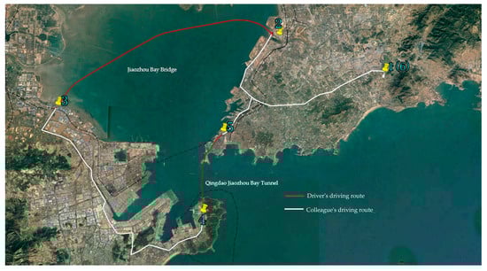 - The route for vehicle driving experiments is shown in Figure 4. An assistant drove the vehicle from Point 1 to a stop near Point 2, where the experiment participant took over driving from Point 2 to Point 3, which included the Jiaozhou Bay Bridge. During the experiment, this assistant observed traffic and road conditions from the front passenger seat to ensure driving safety. Another assistant observed the drivers’ eye movement focus areas and changes in physiological signal data. When the driver’s eye focus area is fixed on a single point, or there are abnormal changes in the ECG signal, the assistant inquired if the driver is experiencing a state similar to hypnosis and recorded the time of the inquiry. After reaching Point 3, the participant rested for 15 min while the equipment was removed, checked, and adjusted, including battery levels. Then, an assistant drove the vehicle to a stop near Point 4, where the participant resumed driving and repeated the experiment procedure;
