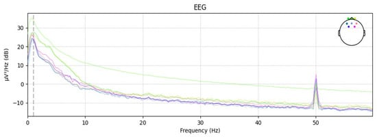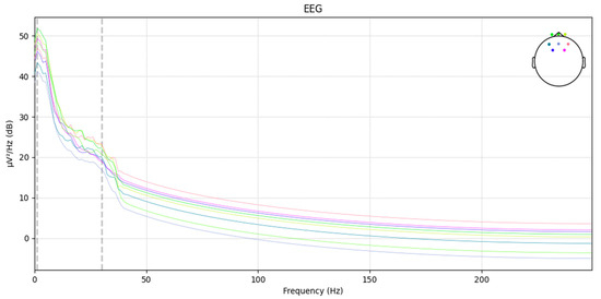 In the transfer function formula of the Chebyshev filter, the ripple parameter can be used to control the amount of ripple in the passband. For processing EEG signals, a smaller ripple parameter is chosen to minimize ripple in the passband, allowing more accurate extraction and analysis of frequency components related to road hypnosis. Additionally, setting the filter order to fourth provides sufficient smoothness and stability, enabling more precise selective passing or suppression of signals within the target frequency range. Below is the power spectral density (PSD) plot of the EEG after filtering. The PSD plot reflects the power or energy distribution of the EEG signal across different frequencies, which is used to observe abnormal states in the EEG signals. Schematic diagram of EEG data after power spectral density processing is shown in Figure 6.