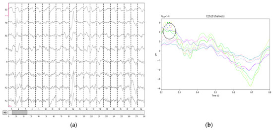 In this study, EEG signals are collected with an eight-channel system. The channel names are Fp2, Fpz, Fp1, F4, Fz, F3, FC2, and FC1. The low-frequency pass is set to 0.1 Hz, and the high-frequency pass is to 250 Hz. Since EEG signals are difficult to label directly, abnormal fixation points from eye movement videos and the times when drivers are actively questioned during the experiment are used as the basis for classification. Event-related potentials (ERPs) during road hypnosis are labeled as “road hypnosis”, and ERPs during normal driving are labeled as “normal driving”. A total of 28,684 ERPs are marked, with 12,513 from vehicle driving and 16,171 from virtual driving. In vehicle driving, 7581 ERPs are labeled as road hypnosis, and 4932 are labeled as normal driving. In virtual driving, 9763 ERPs are labeled as road hypnosis, and 6408 are labeled as normal driving.