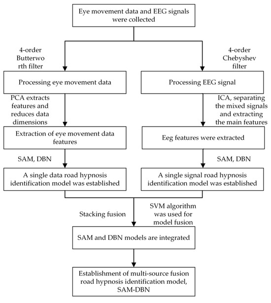 Vehicle driving experiments and virtual driving experiments are designed in this study. A total of 56 participants were recruited based on driving experience. During the experiments, EEG and eye movement data were collected while drivers were in a state of road hypnosis. After the experiments, data are filtered and removed through video observation and expert scoring. This process lays a foundation for developing an accurate road hypnosis identification model. Butterworth and Chebyshev filters are applied to preprocess eye movement data and EEG signals. Feature extraction occurs with PCA and ICA methods on the preprocessed data. Two algorithms, SAM and DBN, construct road hypnosis identification models. The stacking method integrates models with high prediction accuracy, which results in the multi-source data fusion road hypnosis identification model, SAM-DBN. The effectiveness of the SAM-DBN model is assessed with RRSCV and four metrics: accuracy, false positive rate, false negative rate, and specificity. A comparison of the SAM-DBN model with the SAM, DBN, EEGNet, and LSTM models shows that the SAM-DBN model exhibits superior generalization ability and identification effectiveness.