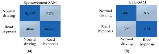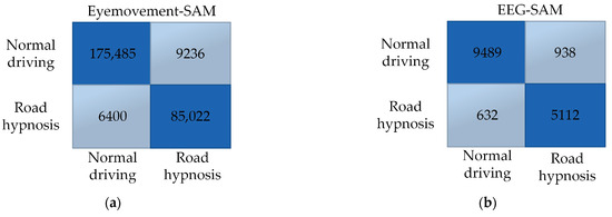 Overall, the SAM model with eye movement data performs better in virtual driving simulations, while the DBN model with EEG data demonstrates superior performance. The resulting confusion matrix is shown in Figure 14: