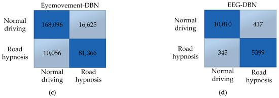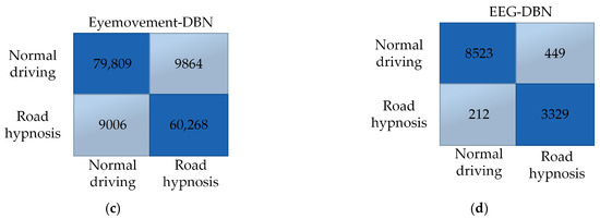 Vehicle driving data results. (a) Eye movement-SAM. (b) EEG-SAM. (c) Eye movement-DBN. (d) EEG-DBN.