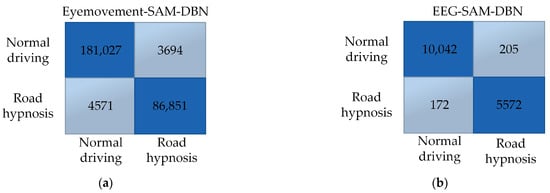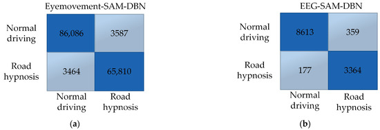 Road hypnosis identification models are established in this study, using eye movement data and EEG signals combined with SAM and DBN algorithms. Models with high accuracy in identifying road hypnosis are fused to improve the effectiveness of road hypnosis detection and better identify drivers’ road hypnosis states. RRSCV is used to validate the models. This method generates multiple training and testing datasets through repeated random subsampling and uses these datasets to estimate the models’ generalization performance. RRSCV ensures that all results are used for training and testing, with each result used once in both processes, allowing for a more accurate assessment of model performance. The resulting confusion matrix is shown in Figure 13: