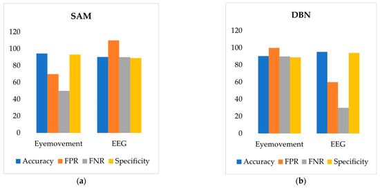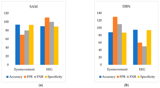 According to Figure 17a and Figure 18a, the SAM model based on eye movement data outperforms the DBN model in both accuracy and specificity while also showing a lower False Positive Rate (FPR) and False Negative Rate (FNR). This indicates that the road hypnosis identification model with the SAM algorithm performs better in identifying road hypnosis. On the other hand, Figure 17b and Figure 18b show that the DBN model based on EEG signals excels over the SAM model in accuracy and specificity, with lower FPR and FNR as well. This suggests that the DBN model provides higher accuracy in identifying road hypnosis during driving.