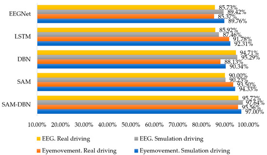 Figure 19 shows that in both virtual and vehicle driving experiments, the accuracy of the SAM-DBN model is significantly higher when eye movement data and EEG signals are provided as inputs, compared to the SAM, DBN, EEGNet, and LSTM models alone. This result demonstrates that the combination of the SAM and DBN models improves the accuracy of road hypnosis identification more effectively. In addition, the comprehensive application of multi-source data allows for a more complete capture of driver states, which leads to better identification of road hypnosis. However, the accuracy of the model still shows some misidentifications. This is related to the generalization capacity limit of the deep learning model. This limitation is an inherent feature of the deep learning model because the performance of the deep learning model is highly dependent on the distribution of training data. If there are insufficient samples or similarities in features for certain states in the training data, the subtle differences between these states may not be fully captured by the model, which affects its generalization capacity.