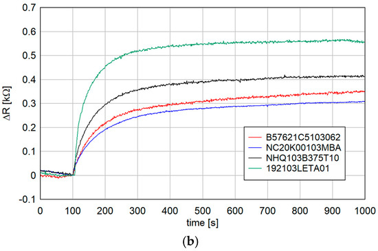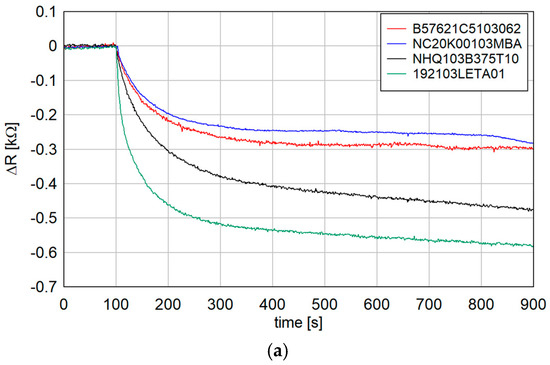 To confirm the usefulness of the chosen thermistors and compare the influence of incident radiation on their resistance, a simple test with direct thermistors illumination was performed. The obvious unknown was the absorption process by thermistors. All of the thermistors were used without an additional absorption layer. Electromagnetic radiation was absorbed directly by the NTC. A simple experimental setup was prepared to verify how the resistance changes with THz radiation. Each thermistor was placed in front of the 100 GHz emitter while the resistance was measured. The power density in the measurement plane was about 2 mW/mm2. During the measurement, they were additionally isolated from the external influence of visible and infrared radiation and airflow. The results of the resistance change during the turning of the radiation on and off are presented in the Figure 3 below.